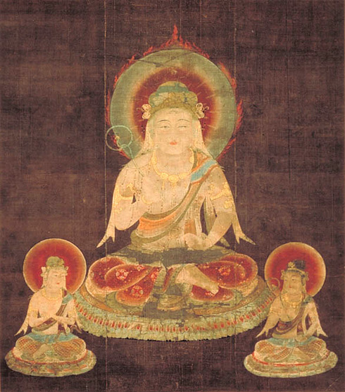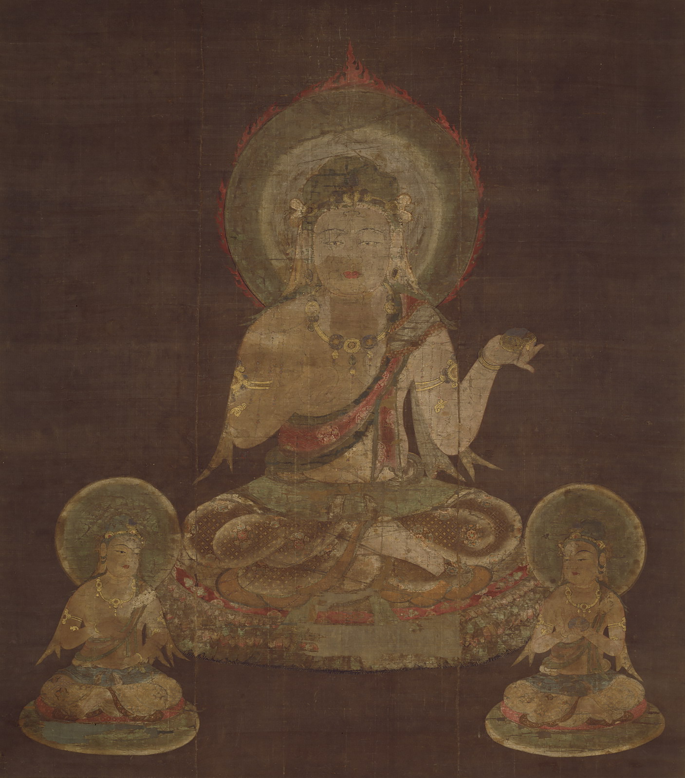The draped folds of the robes are created with various gradation and highlighting techniques in a range of colors and tones. The draped robes are decorated with multi-colored patterns and delicate kirikane (cut gold leaf) motifs, including repeating shippo (seven treasures), manji (reverse swastika), tatewaku (undulating lines) and diagonal check patterns. Other features include the technique of ungen (step-like tone gradations) and the simultaneous use of the four rich colors of blue, red, green, and purple (konntanryokushi).