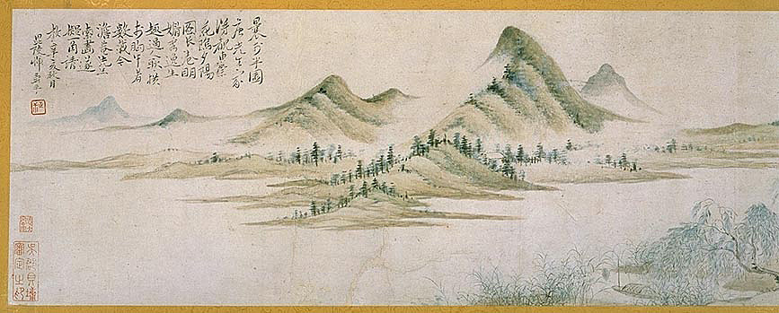 Yun Ge (Yun Shouping, Nan Tien 1633-1690) excelled in flowers-and-bird paintings and is counted, along with the four Wangs and Wu Li, as one of the Six Masters of the early-Qing Dynasty. In his youth, he is said to have been much impressed by the landscapes of Wang Hui. In fear that he could never surpass Wang's landscapes, he turned his focus to the subject of flowers and birds. This scroll, however, is proof that Yun was also an accomplished, landscape artist.