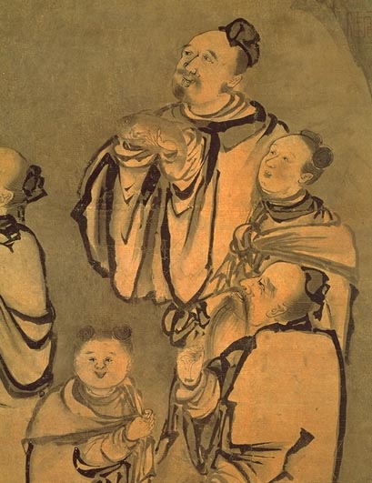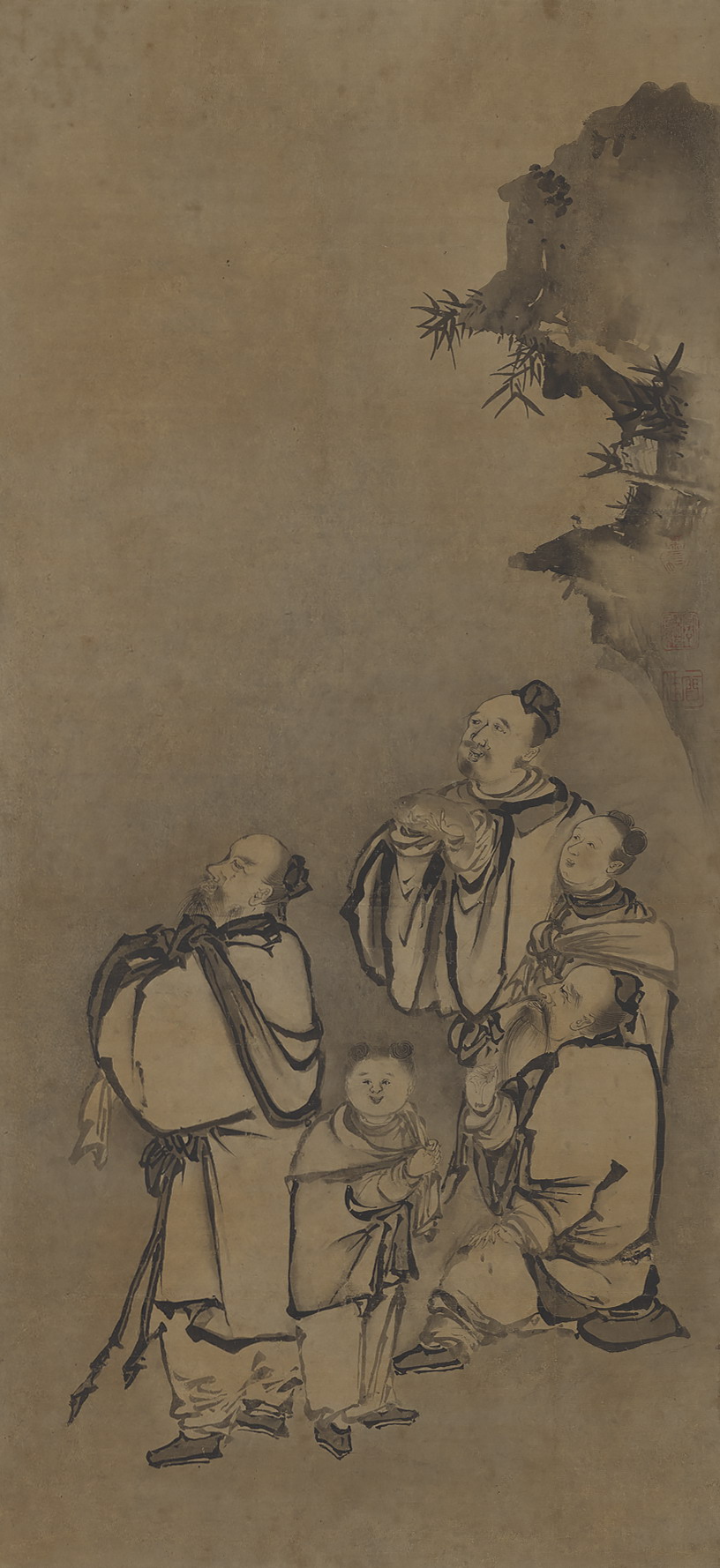 作者の雪村(せっそん)は、室町時代末期に関東や南東北地方で活動した禅僧画家。15、16世紀にかけて、建長寺など鎌倉の禅宗寺院や有力武家の周辺で根付いていた関東土着の水墨画様式(関東水墨画)を基礎としつつ、メリハリとリズム感のある筆法、モチーフの大胆なデフォルメによって、躍動感あふれる独創的な画風を作り上げた。山水や花鳥、道釈人物や肖像画など多くの主題を手掛けたが、特に好んだ画題の一つが神仙(しんせん)で、既存の図様にとらわれない作例を多く生み出している。本作は雪村の神仙図の代表作の一つとして著名なもので、河神である龍を捕えるべく鯉に乗る琴高仙人を中幅に据え、左右に興味津々でそれを見守る仙人と侍童(じどう)たちを配置する。人物描写に雪村ならではのユニークなデフォルメを施しつつ、躍動する線描と鋭敏な墨の濃淡によって、光や風の表現効果をもたらすことに成功している。