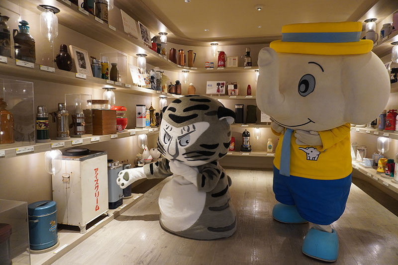 こんにちは、トラりん!まほうびん記念館へようこそ。館長の杉山です。こちらは、象印マホービンの公式キャラクター・ぞうさんだよ。