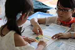 当館の「ミニ掛軸をつくろう」ブースでは、ユーススタッフ(東北の大学生)と一緒に、包装紙を用いたミニ掛軸作りをしました。日本美術では、作品とともに、それを飾るための仕組みにも心を配っていることを知ってもらうためです。作品に似合う包装紙を選び、パーツを糊で貼るだけなので、作り方はシンプルですが、出来上がりは本格仕様です。完成した掛軸に、参加した子ども達もご満悦の様子でした。約90名の子ども達が参加し、色とりどりの個性豊かな掛軸が出来上がりました。