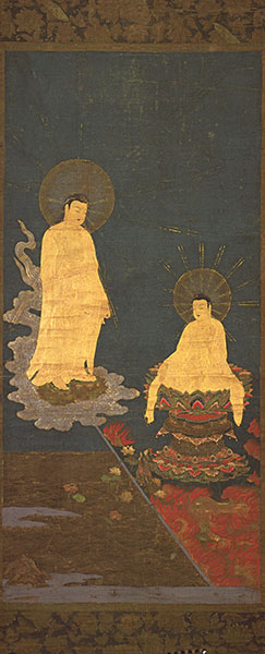 時宗の宗祖一遍の、阿弥陀浄土への信仰はどのように生まれたのだろうか。その源流には、中国で説かれ、日本で独自に発達、展開をとげた浄土教の教えがあるだろう。『一遍聖絵』などに描かれた一遍の生涯を紐解くと、熊野明神への信仰、善光寺阿弥陀、当麻曼荼羅や二河白道図などの作例、あるいは法然、證空といったさまざまな人々からの影響をうけていることがわかる。本章ではそれらに関する作品をご覧いただき、一遍にいたるまでの阿弥陀信仰の流れを概観する。