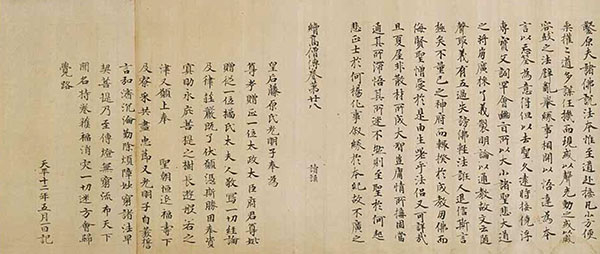 聖武天皇の后である光明皇后(701~760)は篤く仏教に帰依し、亡父藤原不比等(ふひと)と亡母県犬養三千代(あがたのいぬかいのみちよ)の追福のために、仏典の一大集成である一切経の書写を発願しました。これらの経典には、奥書に「天平十二年(740)五月一日記」とあることから、「五月一日経」と呼ばれています。遣唐使が持ち帰った仏典を手本として、一点一画おろそかにせず、官立の写経所において書き写された五月一日経は、中国唐代の仏教を正しく反映する貴重な経典です。たとえ、そこに記される経典の内容は分からなくても、写経体と言われるやや扁平(へんぺい)で端正謹厳(たんせいきんげん)な楷書が、一糸乱れず整然と列ぶ様子は、見る者に畏敬(いけい)の念を抱かせます。どうぞ、1200年以上の昔、仏の教えを正しく伝えようという信仰が生み出した美をご鑑賞ください。